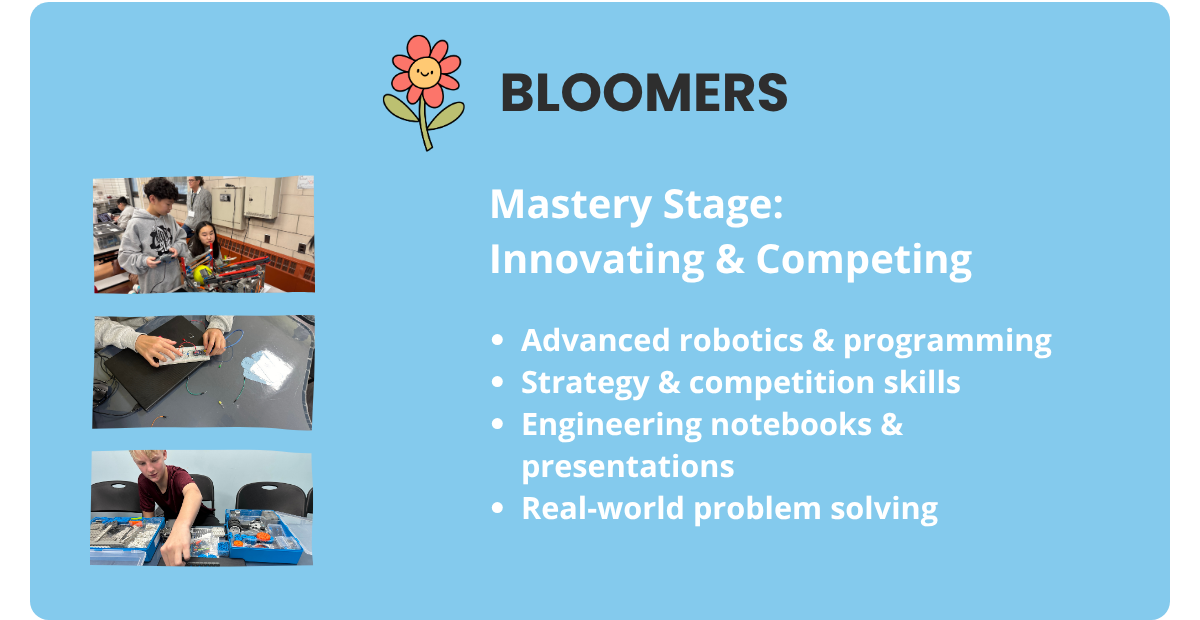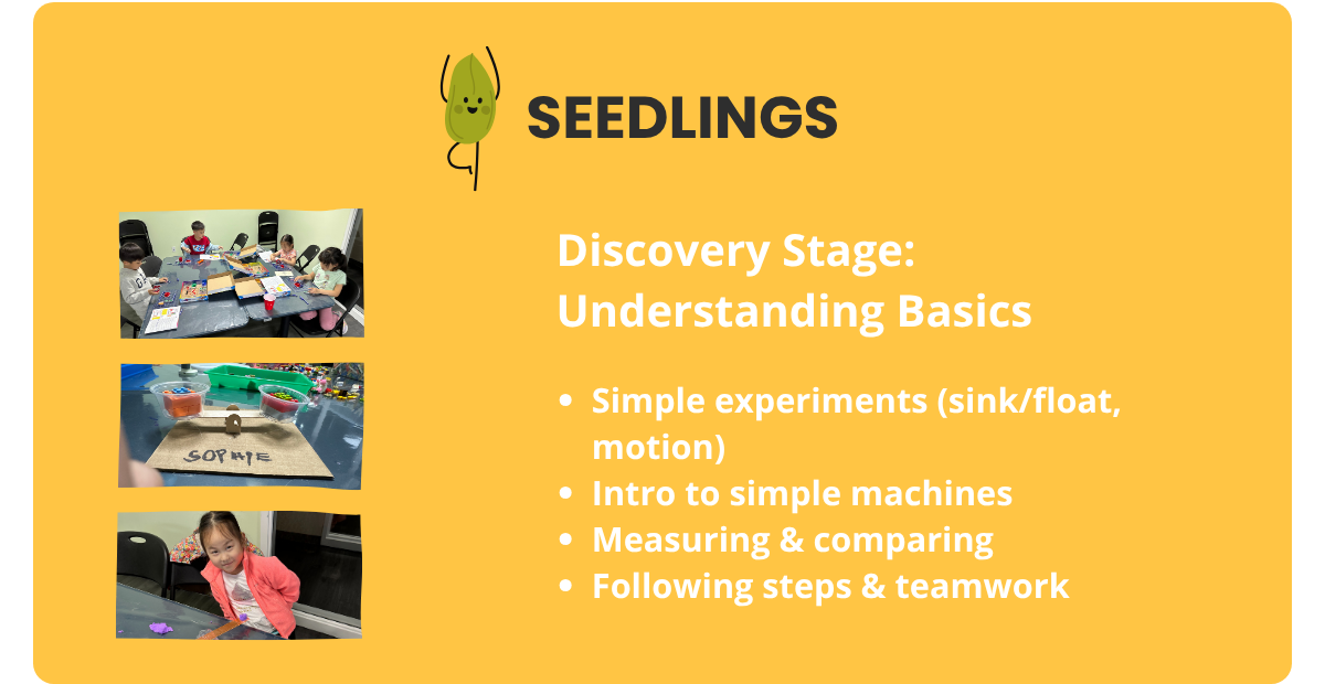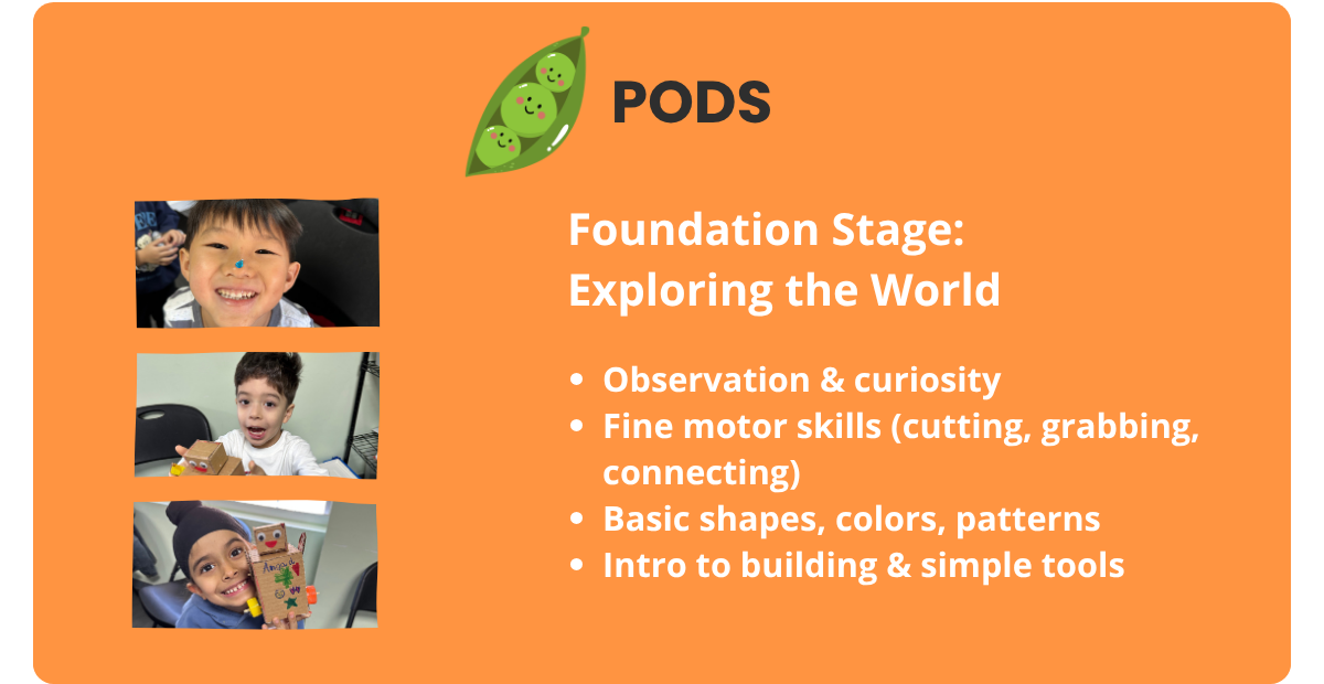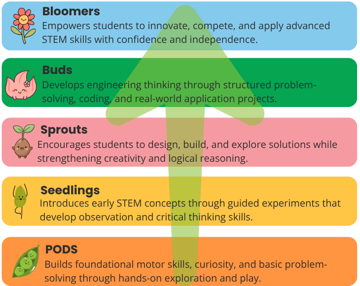 Our program levels guide students from early exploration to confident innovation, building STEM knowledge alongside essential skills like problem-solving, creativity, and critical thinking through hands-on, progressive learning.