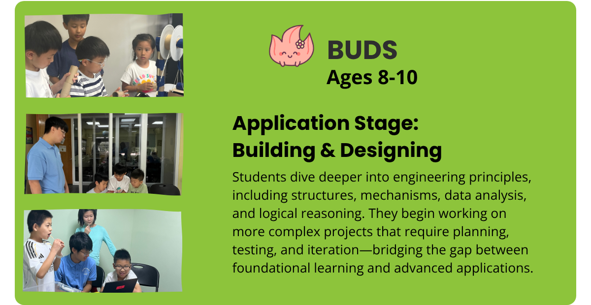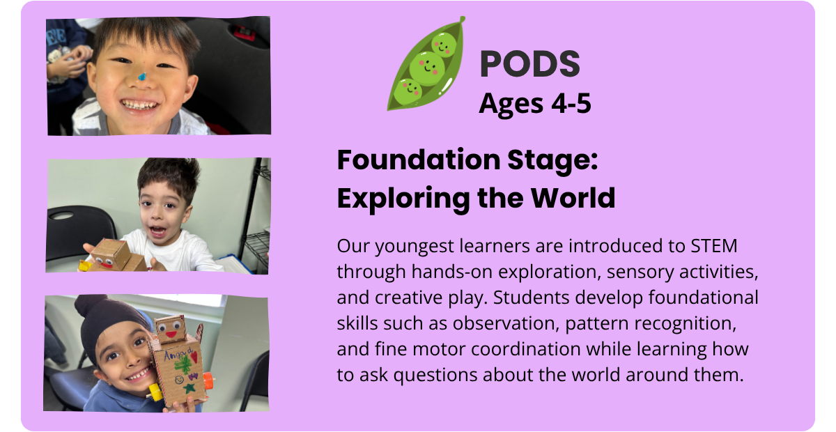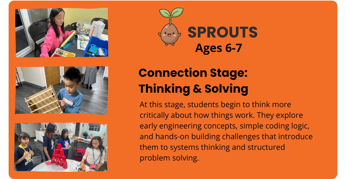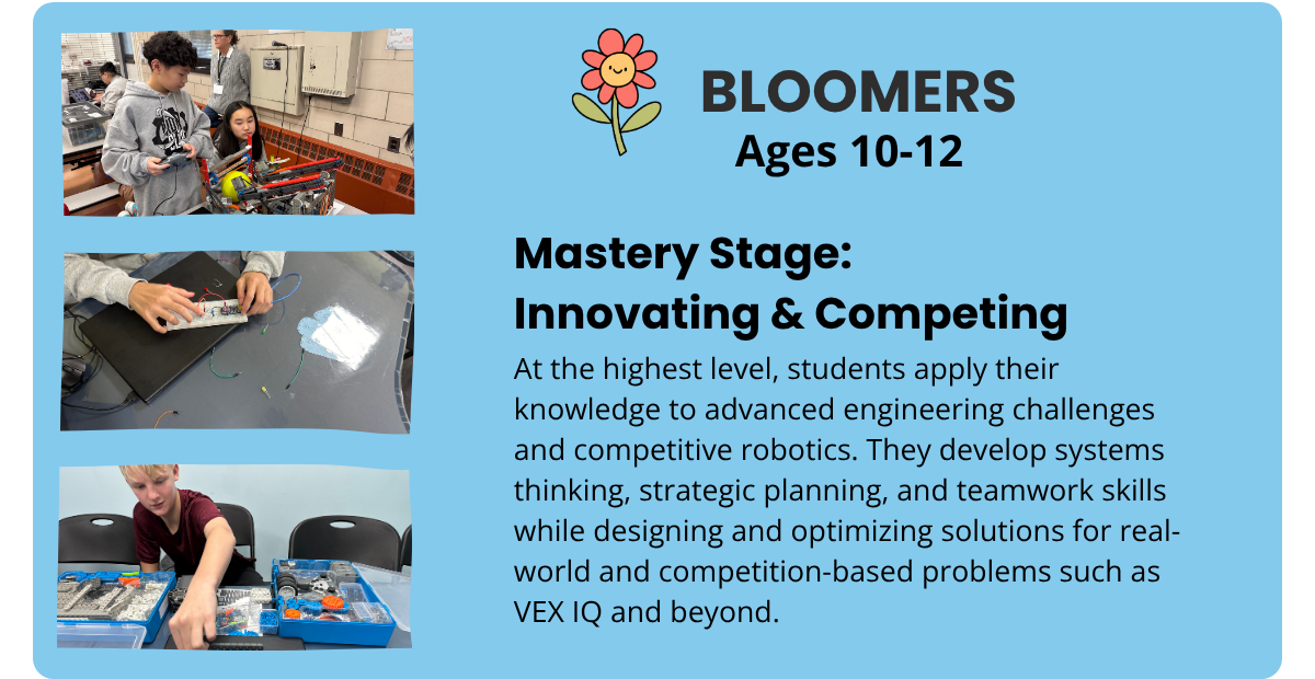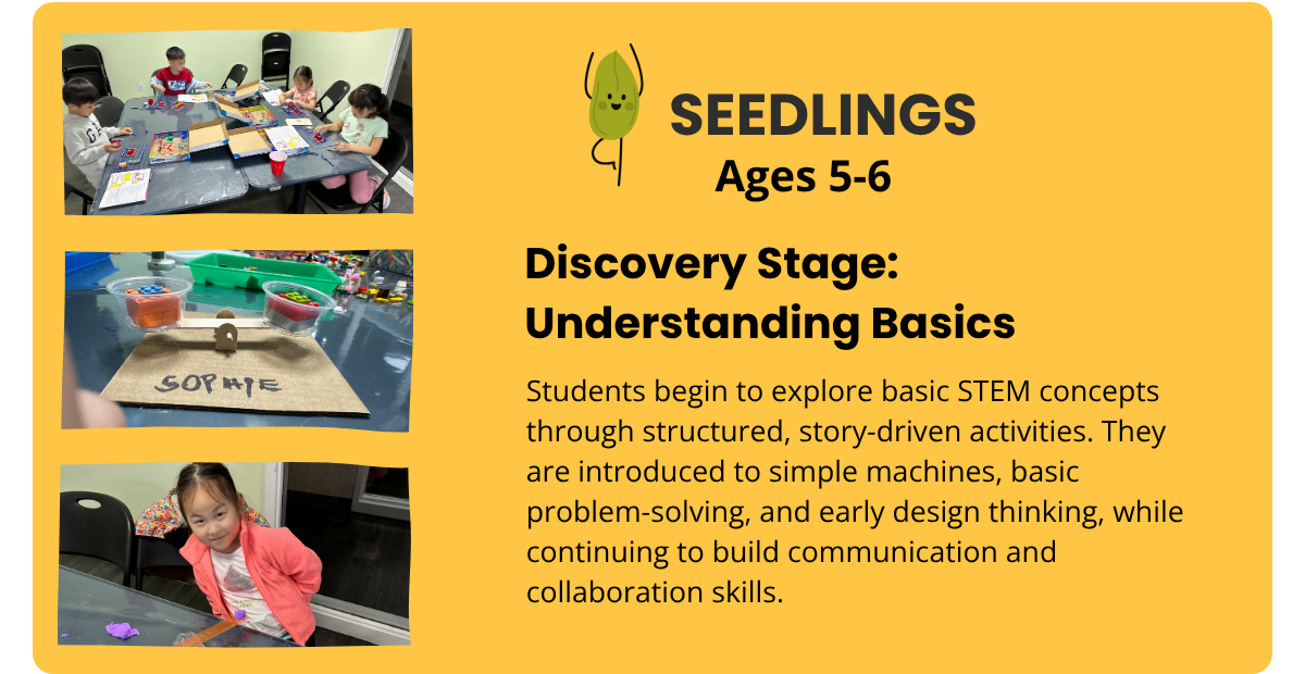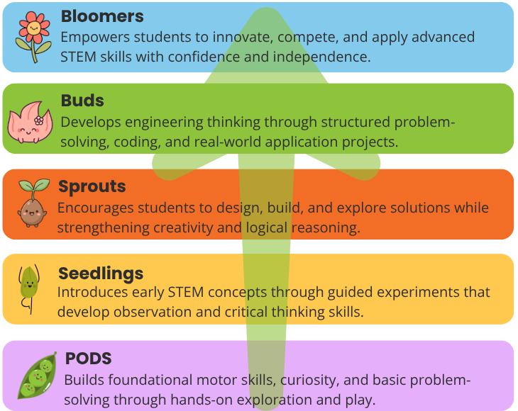 Our program levels guide students from early exploration to confident innovation, building STEM knowledge alongside essential skills like problem-solving, creativity, and critical thinking through hands-on, progressive learning.